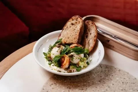Представьте себе два идеально приготовленных яйца пашот, которые погружаются в нежный йогуртовый соус, дополненный творожным сыром. Это гармоничное сочетание контрастирует с жареными креветками, щедро приправленными пряностями. Чтобы добавить разнообразия, в блюдо включены свежие ингредиенты: огурцы, зеленый горошек и обилие зелени — кинза, базилик и зеленый лук. В завершение перед подачей посыпаются тыквенными семечками, которые добавляют текстурный акцент.