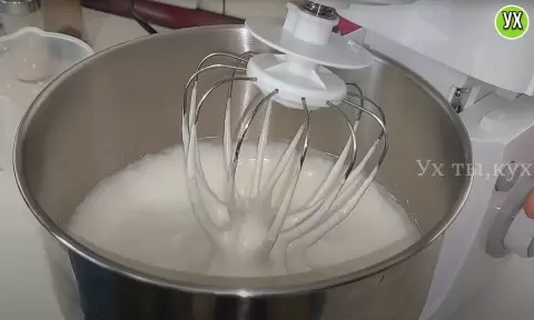 1. Начать стоит с яичной массы. Яйца разбить в миску, добавить щепотку соли и сахар. Взбивать до пышности, чтобы масса была воздушной и светлой.