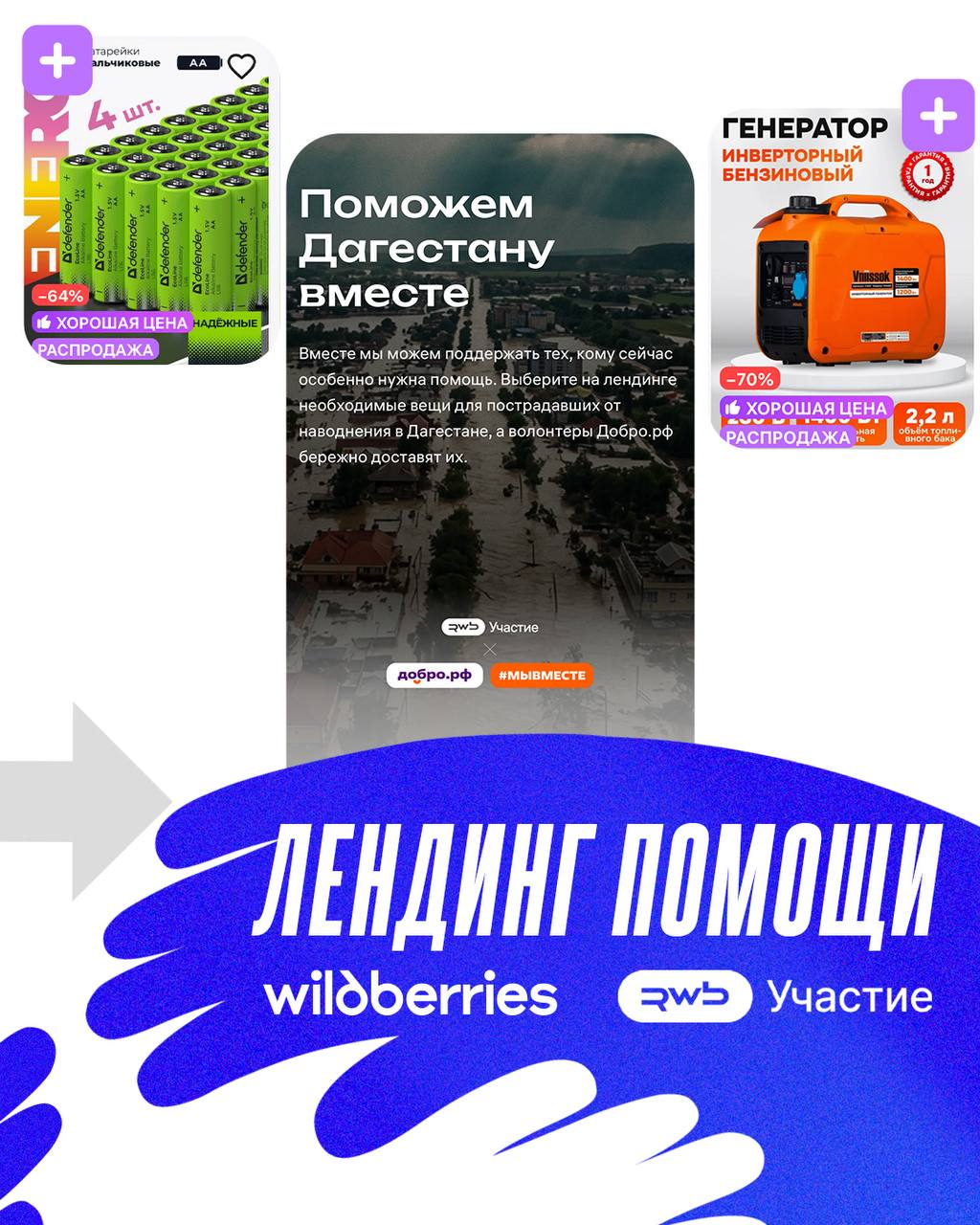 Зайдите на лендинг «Поможем Дагестану вместе» на Wildberries, выберите необходимые товары и отправьте их жителям пострадавших районов
