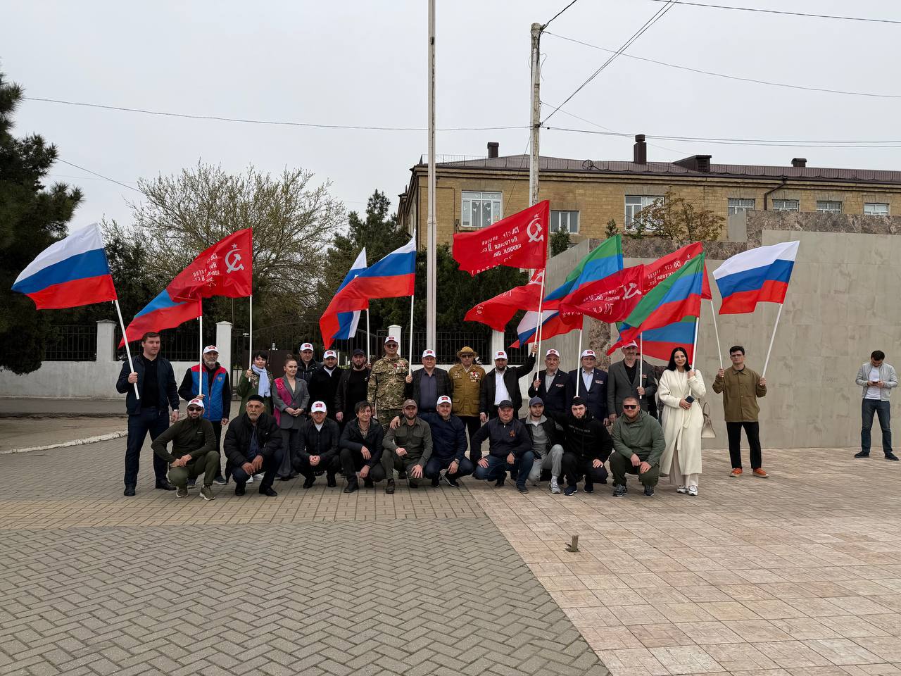 Колонна машин, украшенных флагами и символикой великой даты, выехала из Каспийска. Она