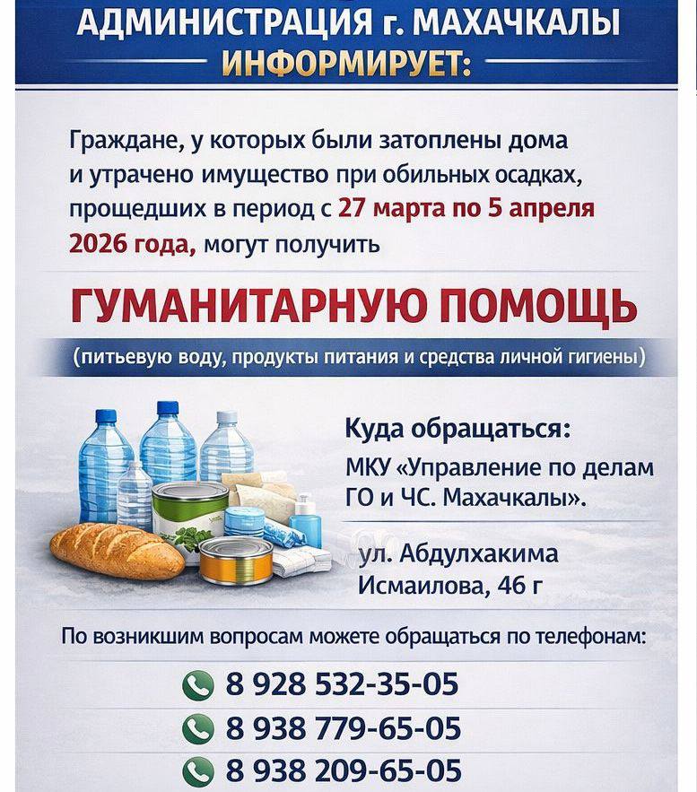 Граждане, у которых были затоплены дома и утрачено имущество в результате обильных осадков, прошедших в период с 27 марта по 5 апреля 2026 года, могут получить гуманитарную помощь (питьевую воду, продукты питания и средства личной гигиены).