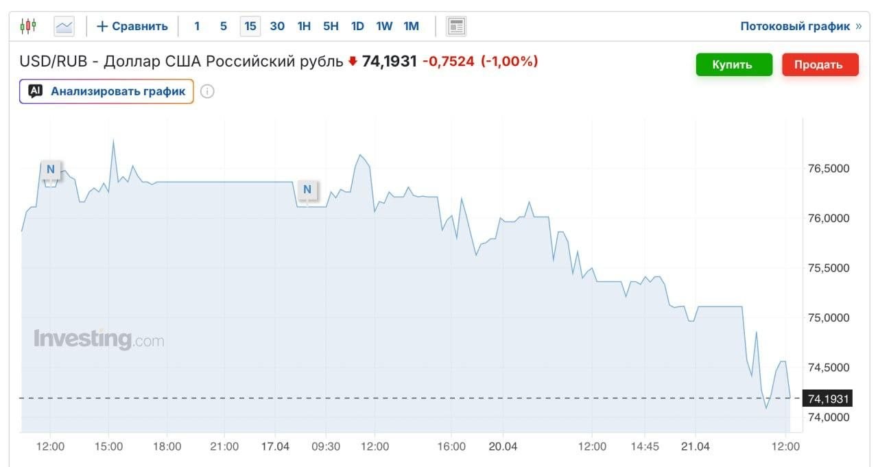 Доллар опустился ниже 74,5 рублей. Последний раз такой показатель был в 2023 году.