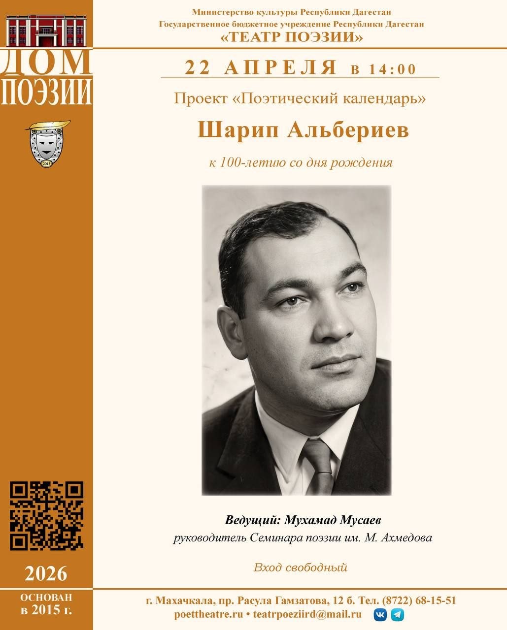 22 апреля в 14:00 в рамках проекта «Поэтический календарь», в Театре поэзии состоится встреча к 100-летию со дня рождения дагестанского поэта Шарипа Альбериева