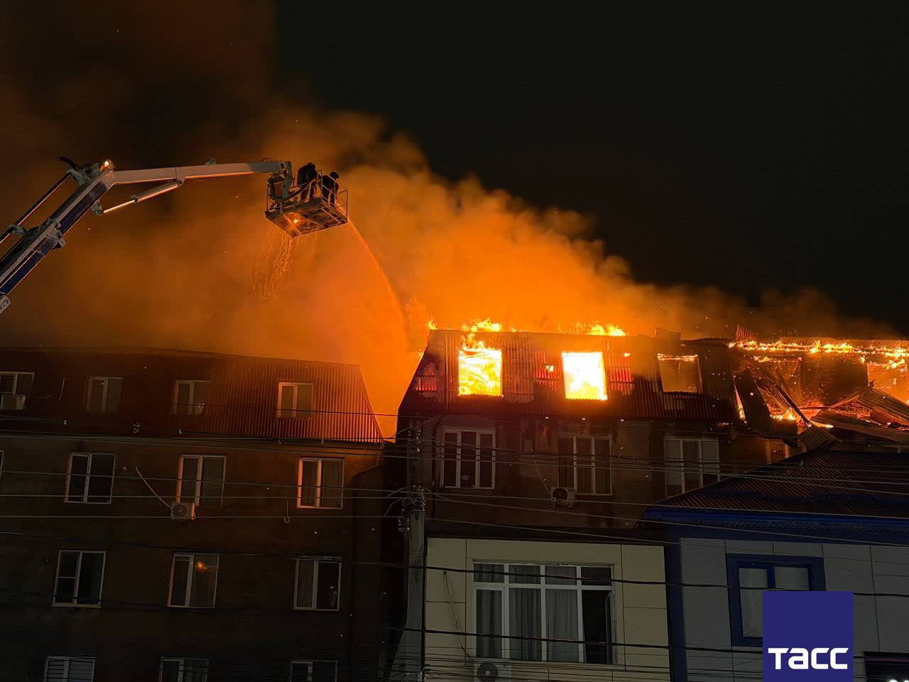 Пожар произошел в жилом многоэтажном доме в Махачкале. Площадь горения кровли достигла 600 кв. метров, сообщается на сайте ГУ МЧС по региону.