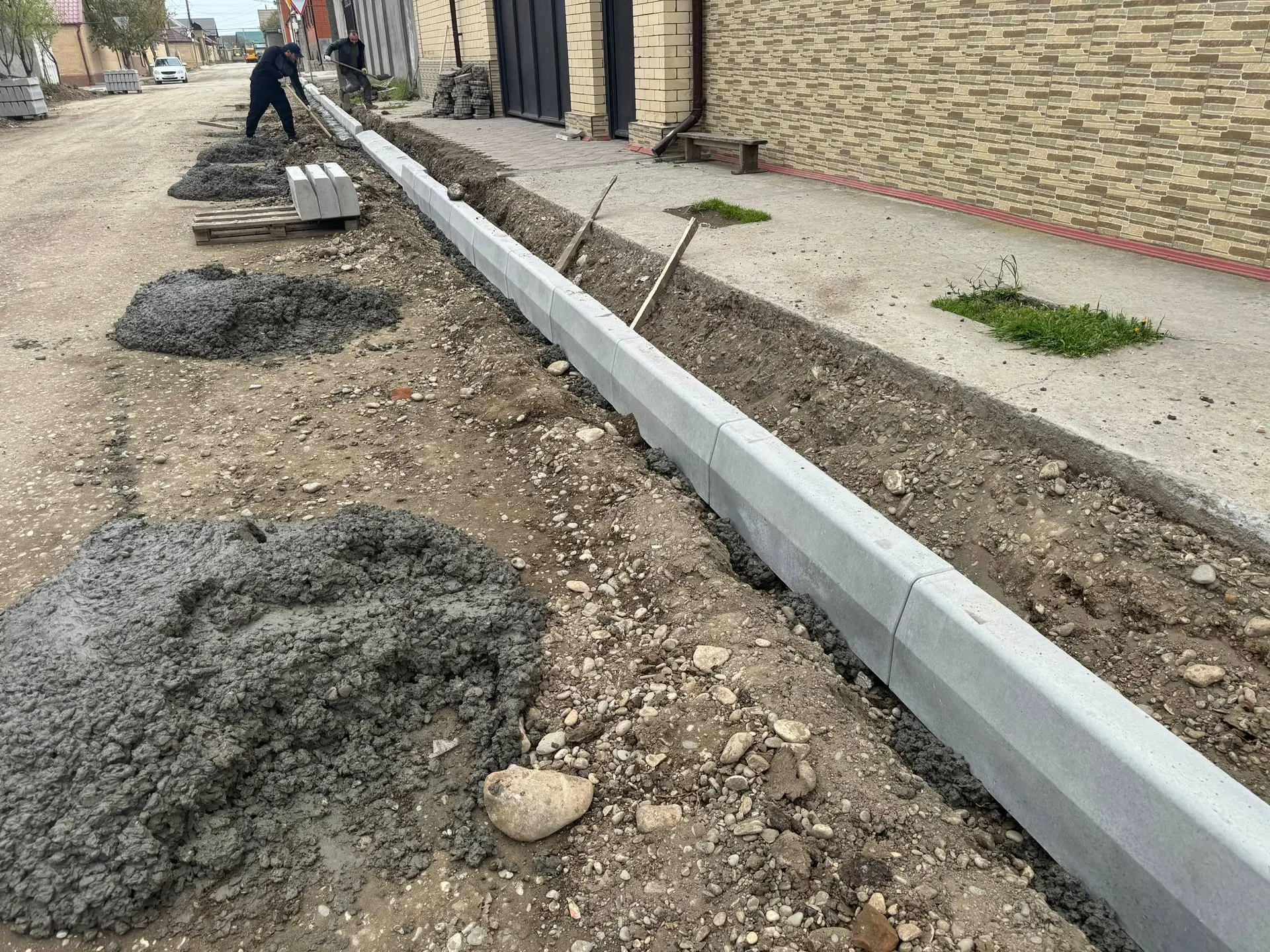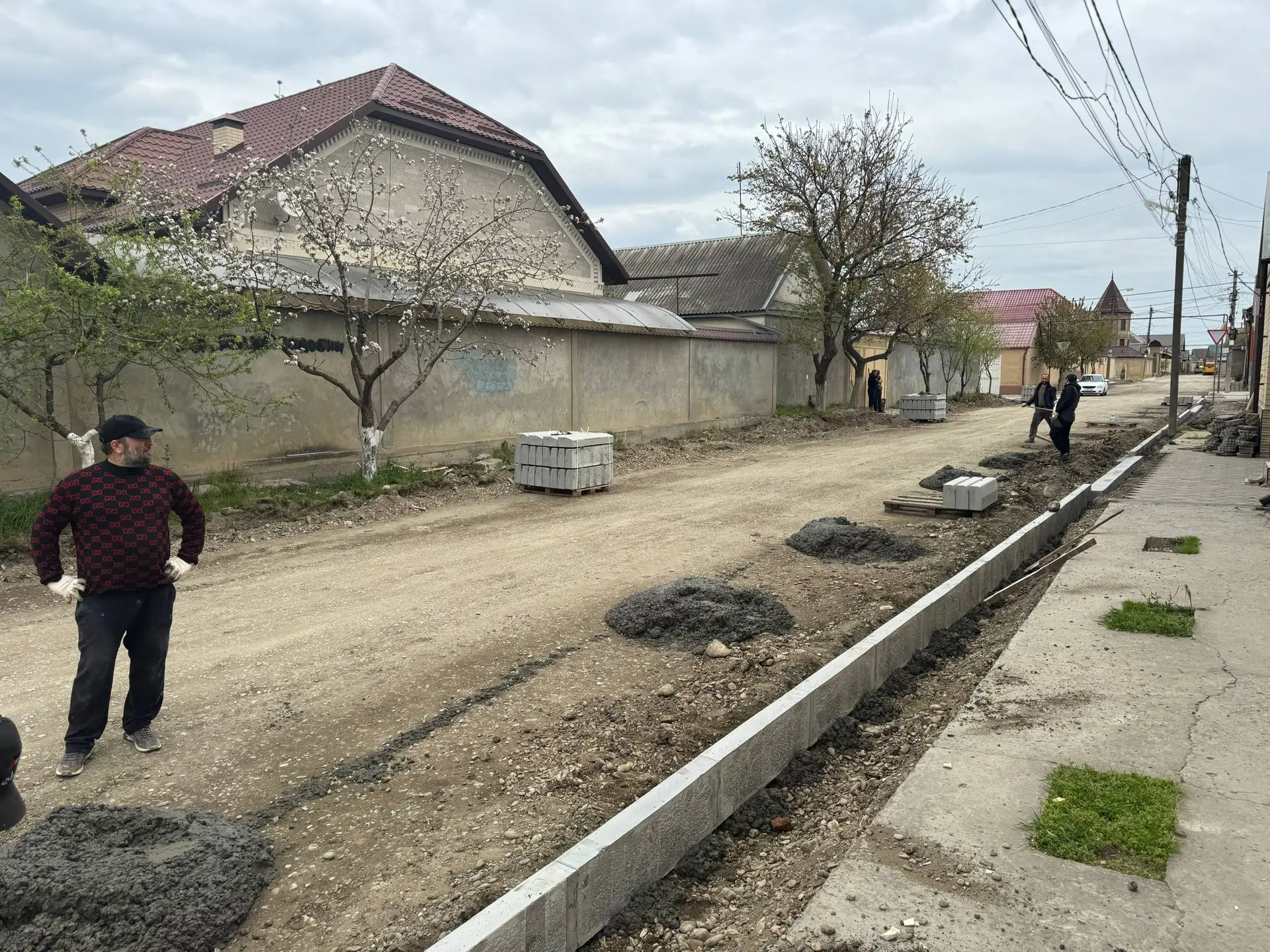 В настоящее время ведутся работы по устройству бортового камня, а также подготовке дорожного основания.