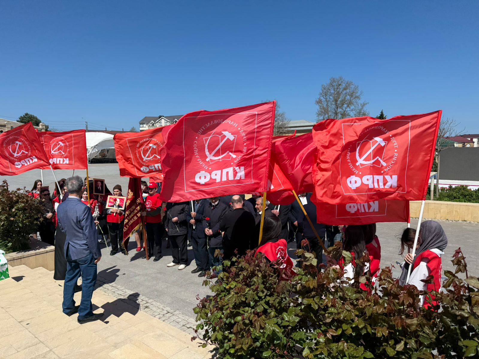 Участники акции с партийными флагами прошли колонной от здания местного отделения на улице Курбанова до памятника на площади Свободы. В мероприятии приняли участие более 40 представителей регионального отделения КПРФ.