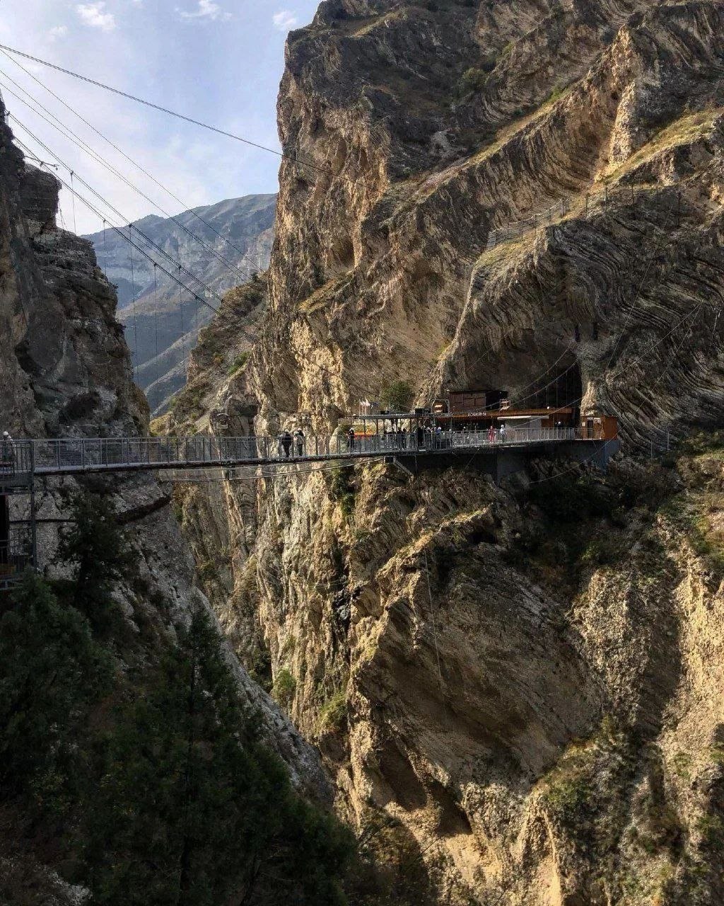 Это бывшие штольни, которые остались от геологической разведки при строительстве ГЭС на Сулакском каньоне. Их расширили, провели освещение и сделали безопасными для посещения. Здесь же есть кафе прямо в скале, где можно выпить кофе на краю каньона. Есть смотровые площадки и подвесной мост на высоте 60 метров над рекой Сулак.
