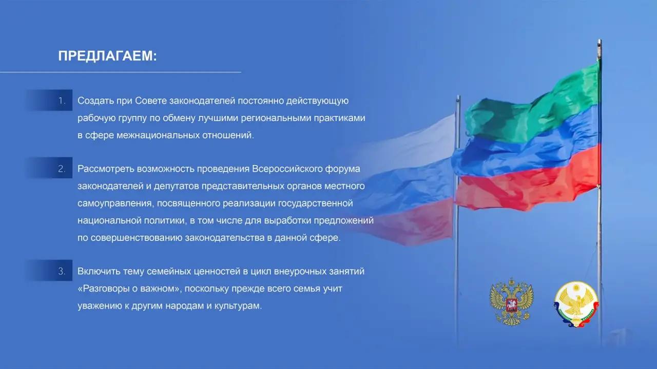 В частности, Заур Аскендеров предложил создать при Совете законодателей постоянно действующую рабочую группу по обмену лучшими региональными практиками в сфере межнациональных отношений.