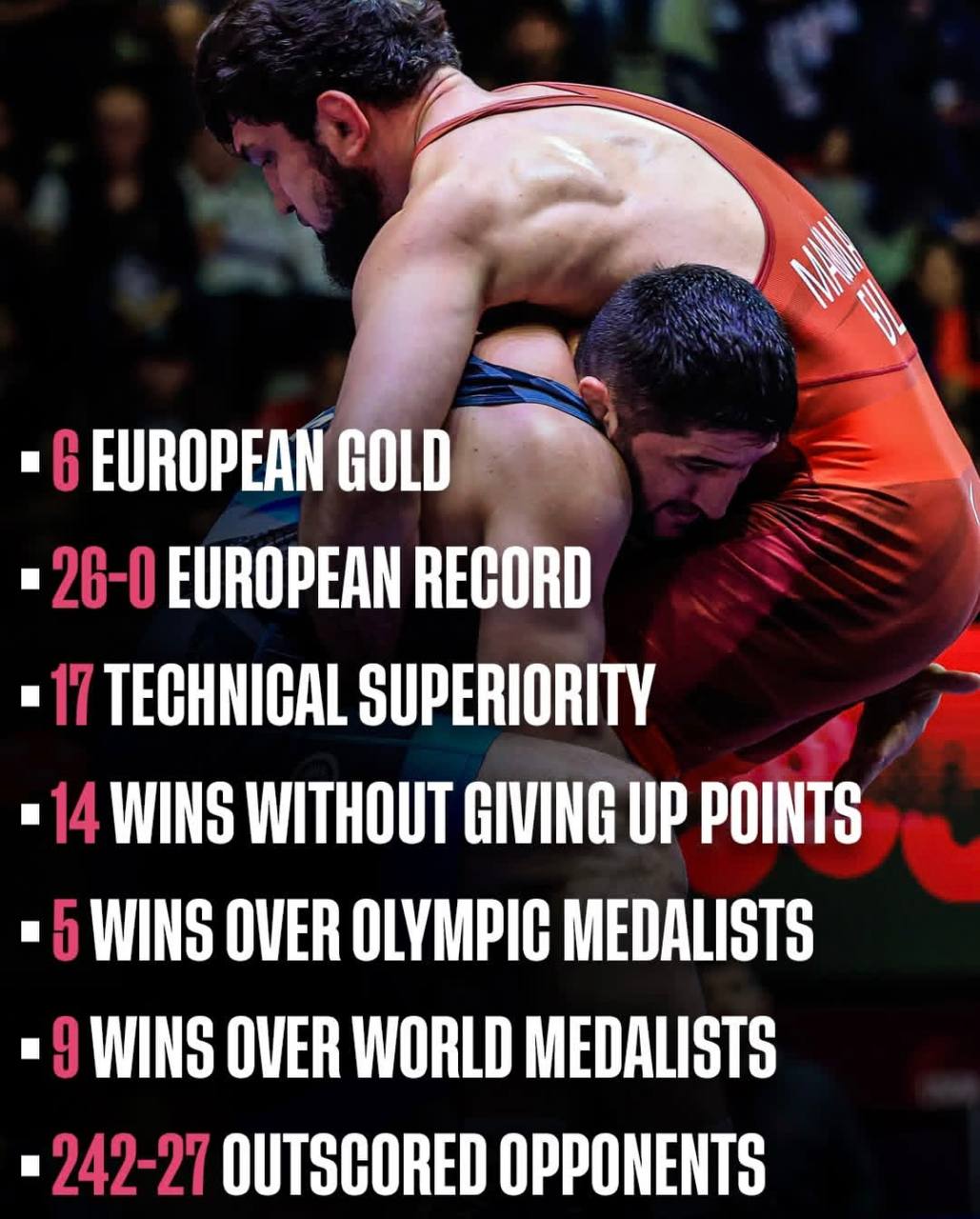Объединенный мир борьбы (UWW) опубликовал статистику выступлений Абдулрашида Садулаева на главных европейских соревнованиях.