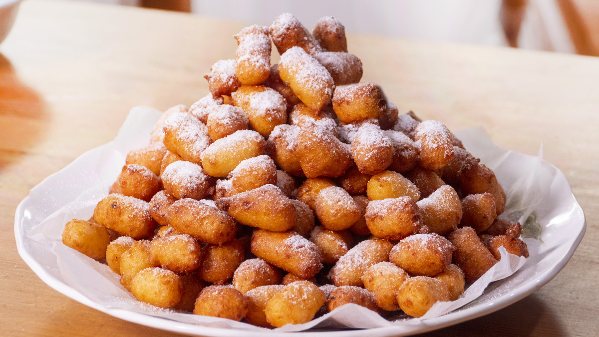 Перед тем как приступать к жарке, добавьте разрыхлитель в тесто и осторожно вмешайте его. Подготовьте кондитерский мешок для подачи теста в горячее масло.