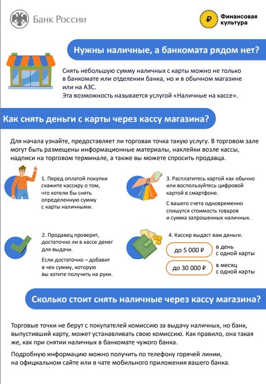 Для получения наличных покупателю необходимо совершить покупку в магазине или оплатить заправку транспортного средства на АЗС и при расчете сообщить кассиру о намерении снять наличные средства с банковской карты.