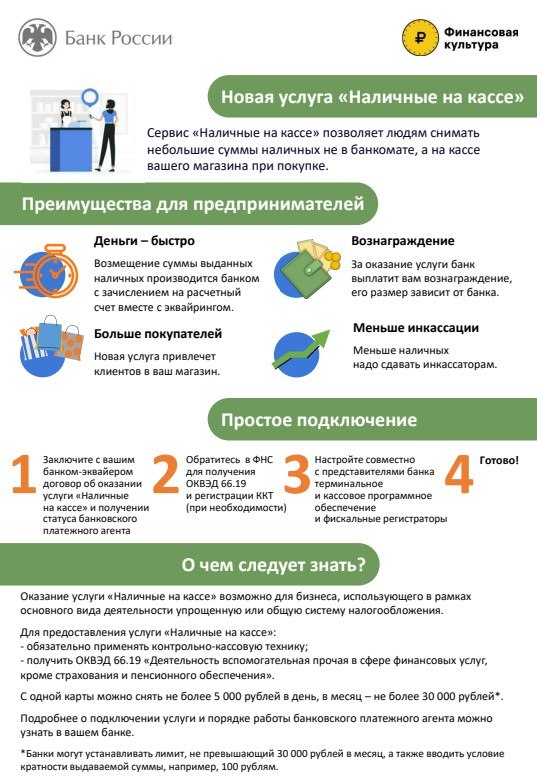 Данная услуга предоставляет возможность покупателю снимать (получать) наличные деньги непосредственно на кассе при оплате товаров или услуг с использованием электронных терминалов.
