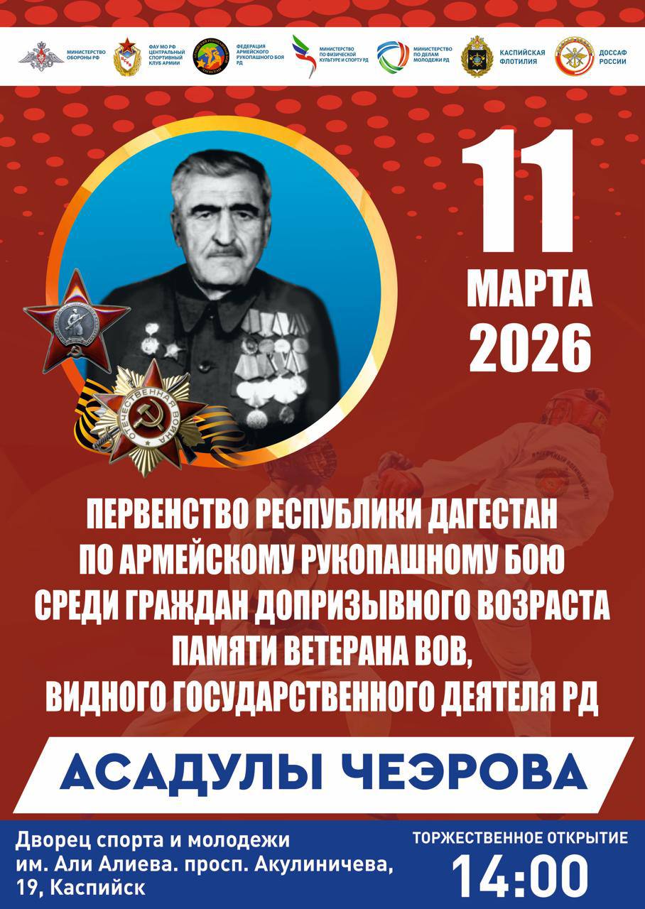 11 марта в Каспийске, во Дворце спорта им. А. Алиева состоится Первенство Дагестана по армейскому рукопашному бою среди допризывной молодежи памяти ветерана Великой Отечественной войны, видного государственного деятеля Республики Дагестан Асадулы Чеэрова.
