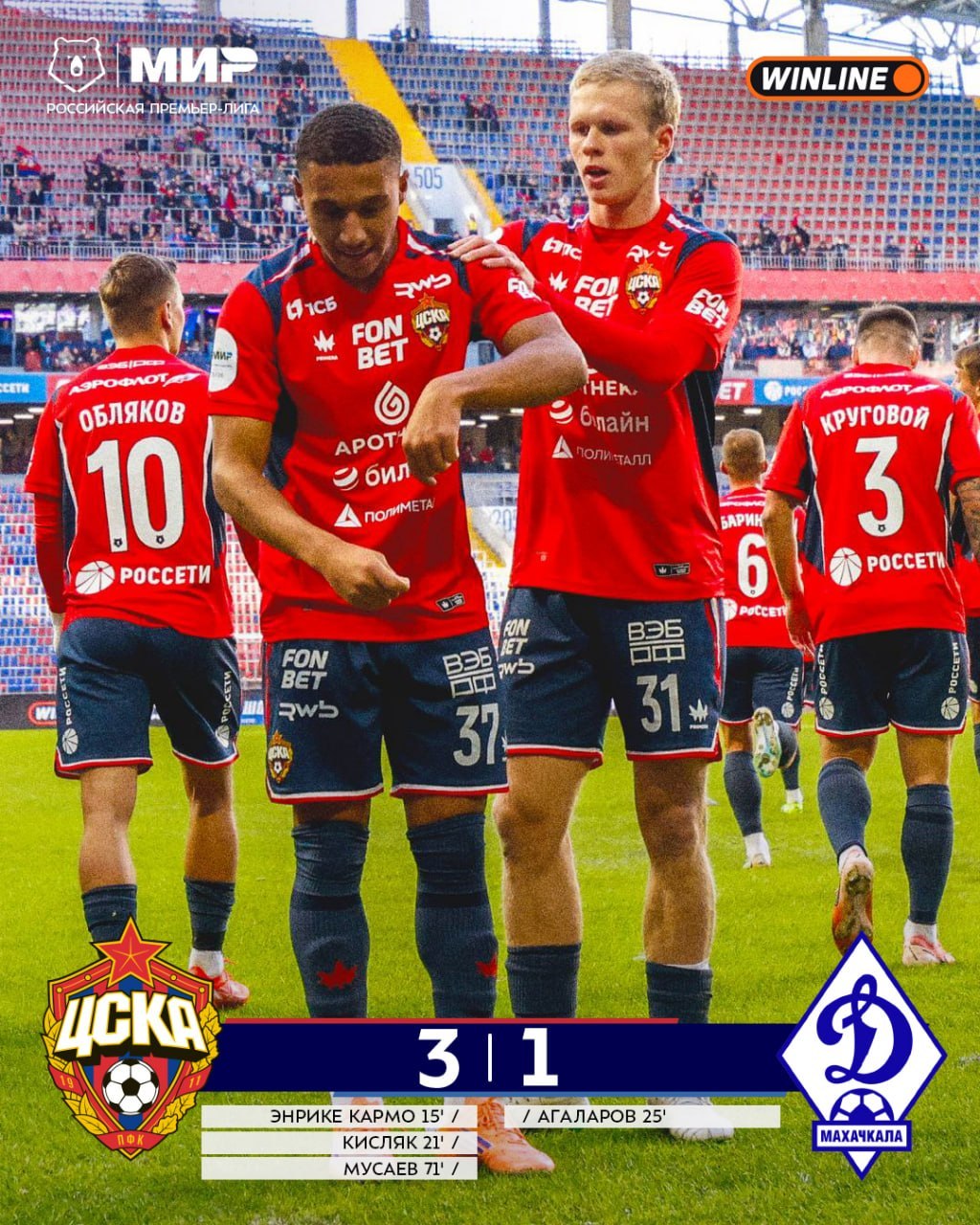 В составе победителей голы забили Энрике Кармо (15-я минута), Матвей Кисляк (21) и Тамерлан Мусаев (71). У проигравших после ошибки Игоря Акинфеева отличился Гамид Агаларов (25).
